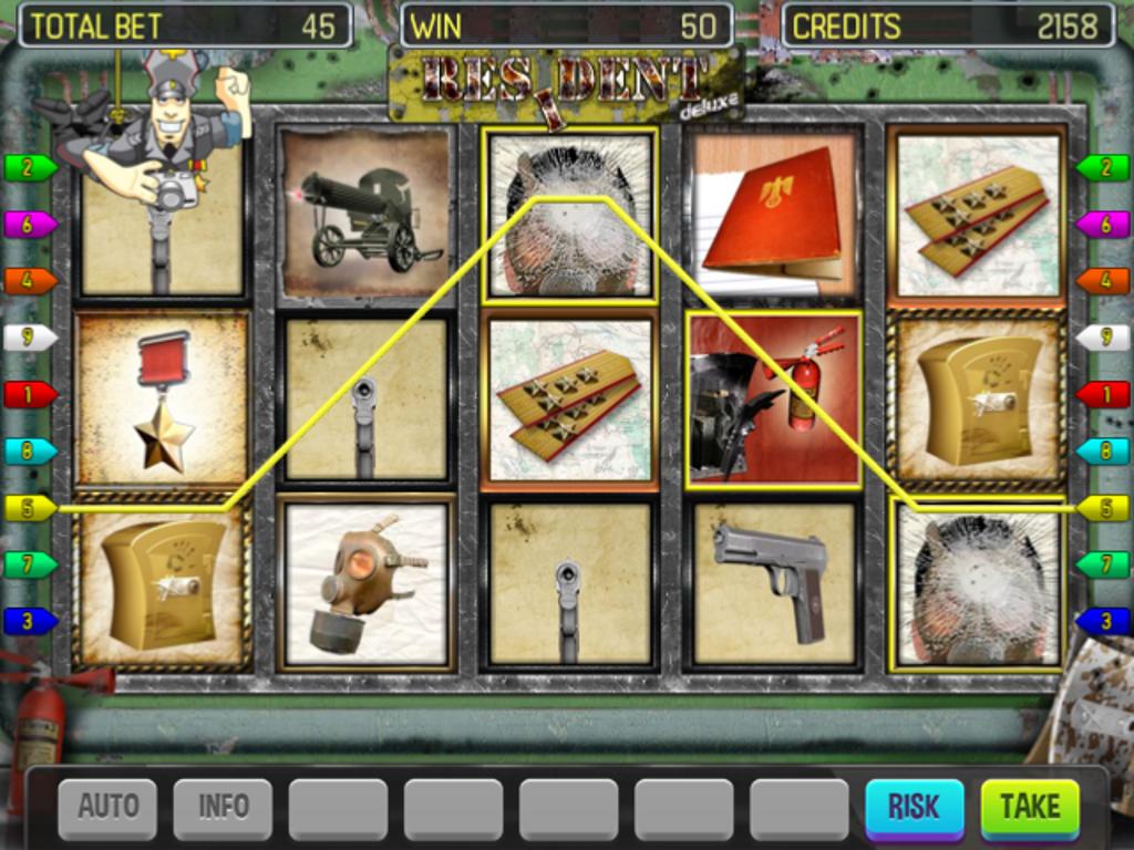 Resident Deluxe игровой автомата подтверждает его дизайном, что вы должны стать офицером военной разведки, который перешел в вражеские задние районы. На барабанах пользователи могут заметить оружие, пулеметы, отметки плеча, медали и другие символы, которые передают соответствующую атмосферу.