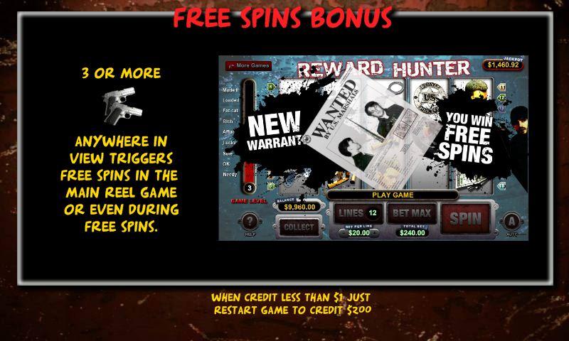 สัญลักษณ์การกระจายปืน 3 ครั้งขึ้นไปทุกที่บนหน้าจอจะทำให้เกิดสปินฟรีได้มากถึง 20 สปินฟรี 'Getyourman' และเกมโบนัส 'สองครั้งหรือไม่มีอะไร' สามารถถูกกระตุ้นได้ในระหว่างการหมุนฟรี
